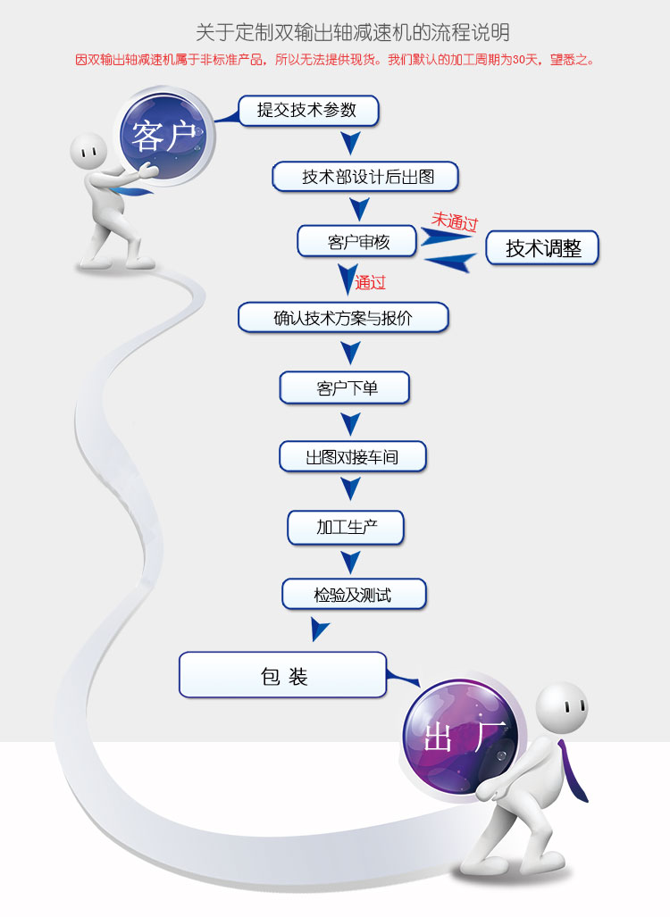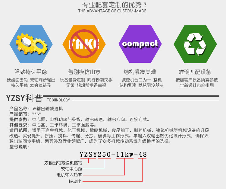 雙輸出軸減速機僅僅是非標準減速機中較有代表性的產(chǎn)品之一,在十多年的產(chǎn)品定制過程中,我們接觸了太多的非標減速機案例,比如6軸、8軸、甚至還有14軸的多軸減速機。其實,我們關心的不是您的設備需要幾根輸出軸,我們關心的是,您的技術參數(shù)是否準確并完整。只要技術參數(shù)到位了,正常情況下,我們都可以給出佳的技術方案。